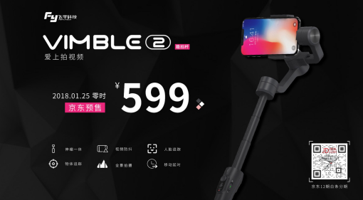 北京时间2018年1月25日,飞宇科技正式发布了 2018 年度首款新品 Vimble 2 ,公布售价599元人民币。这款集可自由伸缩、体感智能操作、蓝牙快门以及多种智能拍摄控制于一体的黑科技产品,将再一次改变手机视频拍摄爱好者的短视频记录方式。