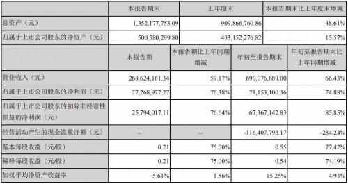 10月24日,凯伦股份(300715.SZ)披露三季报,报告显示,公司2019年前三季度实现营业收入6.9亿元,同比增长66.43%;归属于上市公司股东的净利润7115.31万元,同比增长74.88%,延续了上半年的良好发展态势。