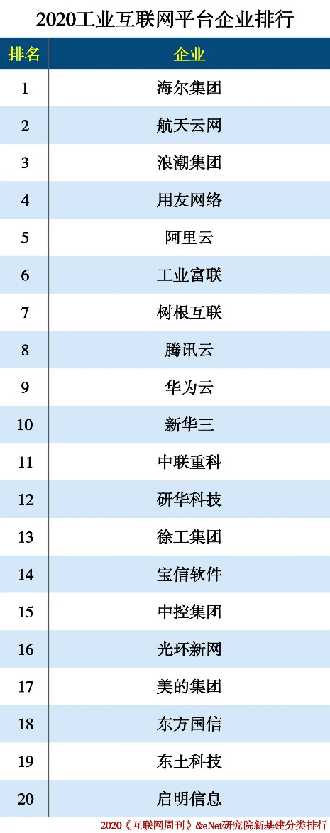 4 月 7 日,中国科学院《互联网周刊》联合 eNet 研究院发布 2020 新基建分类排行榜,分别对 5G 基站建设、特高压、工业互联网等 7 大领域的基础设施建设进行了排行。其中在工业互联网领域,研华科技与海尔、浪潮等企业成功入选TOP20平台企业。