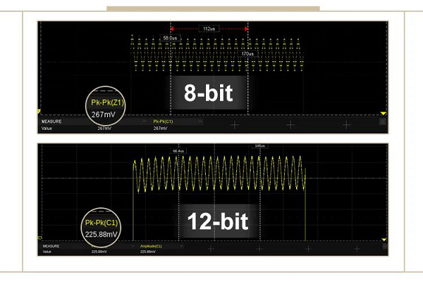分辨率是指一个器件重建细节的能力,而示波器的位数表征了示波器的信号分辨率。分辨率越高,ADC的量化等级越高,意味着示波器能够更精细地显示信号细节并进行更加精准的测量。8-bit分辨率的量化等级为256,而12-bit分辨率的量化等级为4096,这就意味着鼎阳科技采用12-bit ADC的SDS6000 Pro系列示波器是传统8-bit示波器信号分辨能力的16倍,可以轻松观测到更清晰的波形,更多信号细节,并进行更精准的波形测量。