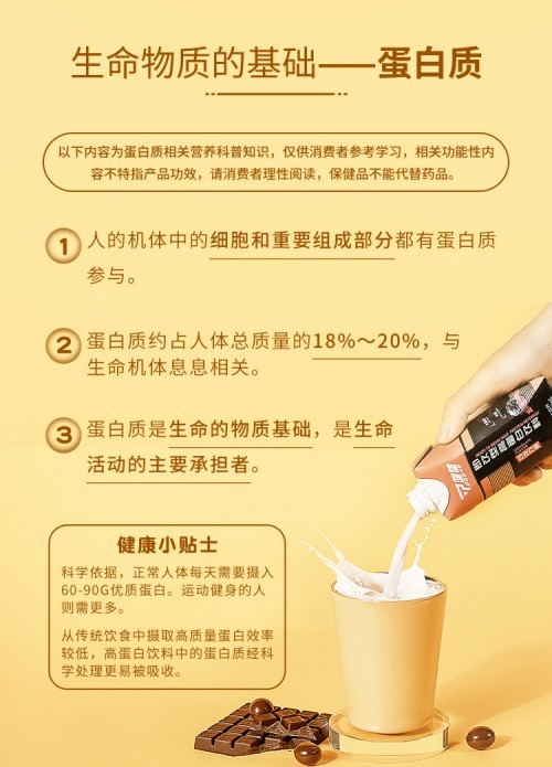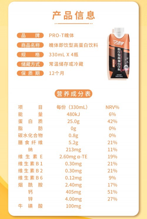 然而在传统的饮食结构中很难补充足够的优质蛋白质,而通过蛋白粉补充又存在不便携、口感不佳的问题。在发现市场巨大需求后,魄体研发团队经过反复研发终于研发推出了一款“便于携带、美味营养”的蛋白质饮料——PRO-T魄体即饮型高蛋白饮料。除了满足传统运动饮料解渴、补充流失水分,以及口感清爽的特点以外,还用易吸收的优质蛋白为消费者快速补充营养,能够充分满足目标人群对运动饮料的功能期许。