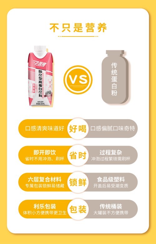 与同品类的其他品牌相比,魄体即饮型高蛋白饮料采用了与金典、特仑苏等高端乳制品相同的利乐包装,这种包装更适用于含乳制品,并具备高度的安全性,增加了产品的稳定性与品质的可控性。而且,可以在不添加任何防腐剂的同时延长产品保质期,味道口感均不会受到影响。