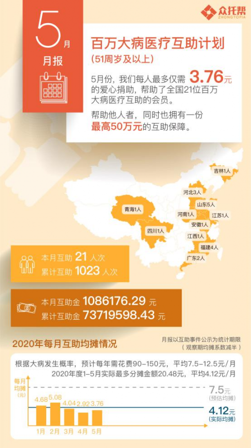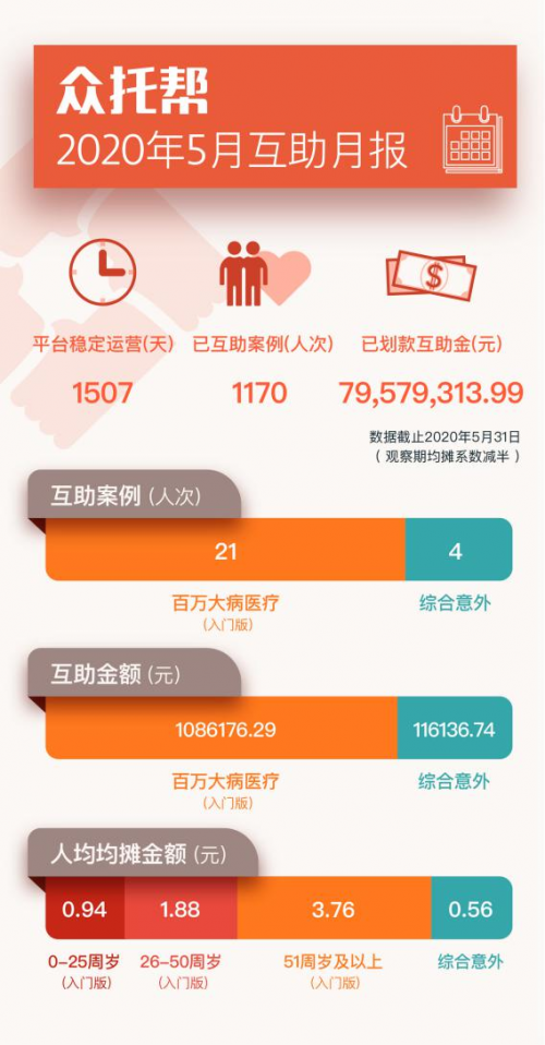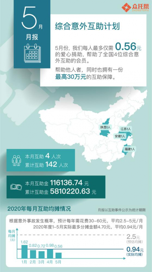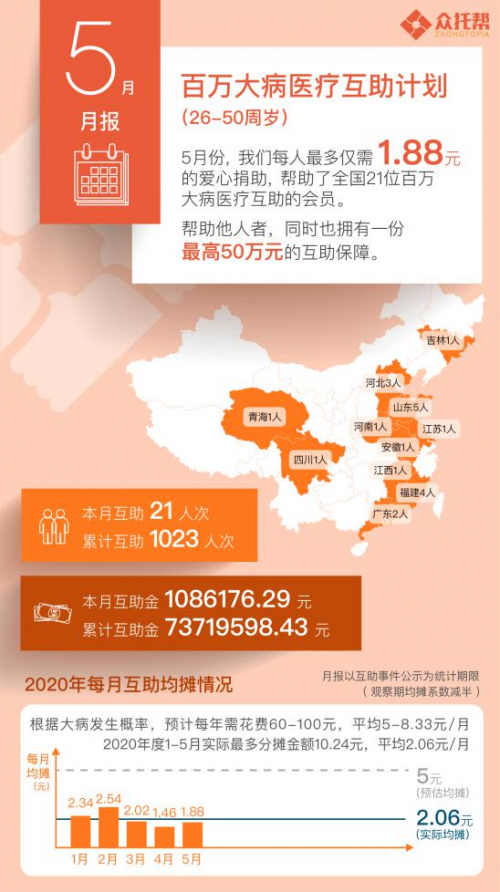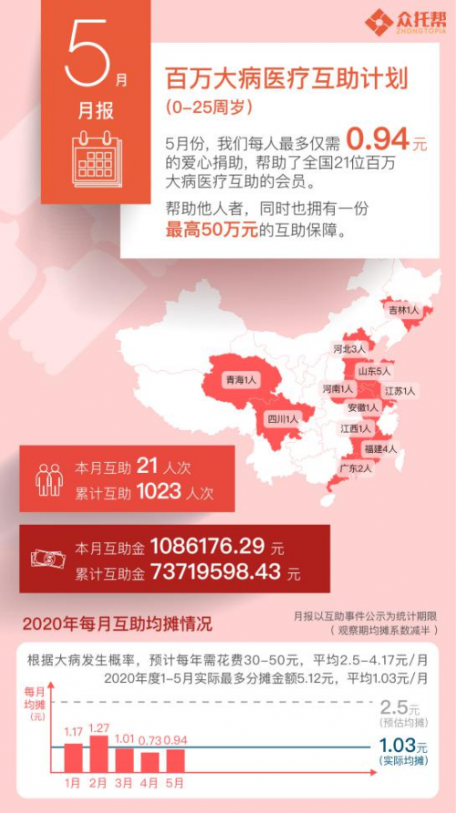 本月初,众托帮公布5月互助月报:本月,25名落难会员获得大家的帮助,大病医疗互助计划均摊金额最高仅需3.76元,最低为0.94元,综合意外互助计划均摊金额仅0.56元,涓涓细流在此汇合,奔向江海。