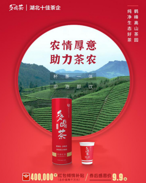 茶农在,希望就在;多喝茶是大自然和茶农的搬运工。为助力湖北茶农脱贫增收,多喝茶公司倾情补贴2000万元,开展“农情厚意,助力茶农”的活动,发放40万个50元购茶红包,原价59.9元的早春红茶杯泡茶、罐装茶,现登陆多喝茶天猫旗舰店、拼多多、多喝茶商城、抖音官方橱窗等各大官方平台领取50元红包抵扣券,即可享受券后感恩价9.9元。美灵宝多喝茶喜欢携手广大消费者为共同助力湖北“疫后重振”,帮扶茶农脱贫致富!