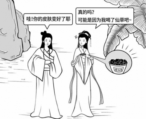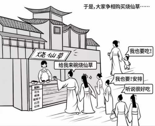 由观音大士种植的仙草,和龟丞相变成的龟苓膏做成的烧仙草就面世了。传言,女人吃了这种烧仙草不仅皮肤变好了,还有美容养颜、清热解火的功效,一传十,十传百,美味又营养健康的烧仙草便在当地流传开来,大家争相购买,备受女性的青睐。