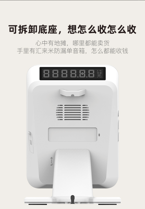 还能适应多种收钱姿势,底座可拆卸,不方便放着咱挂着,不想挂着咱手里拿着也是可以的,想咋收咋收。