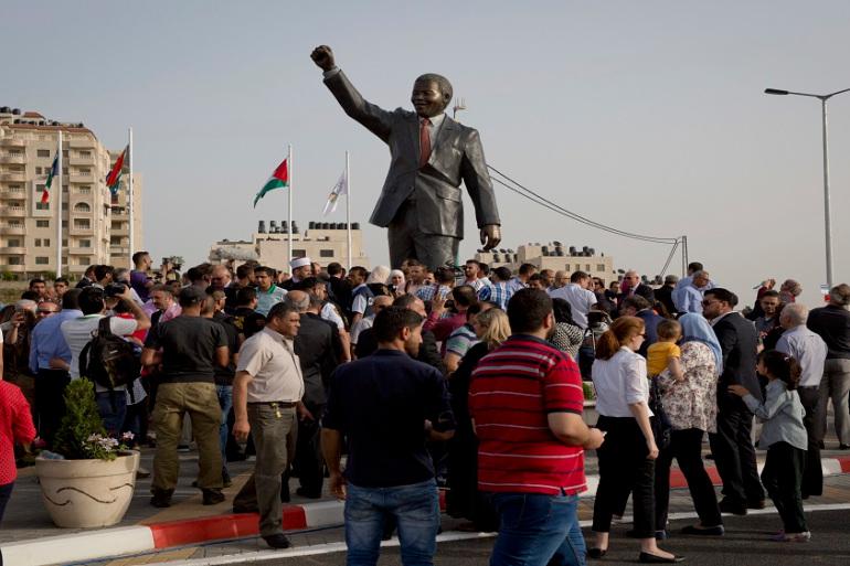 巴勒斯坦人参加反种族隔离领袖纳尔逊·曼德拉雕像的揭幕仪式 (美联社)