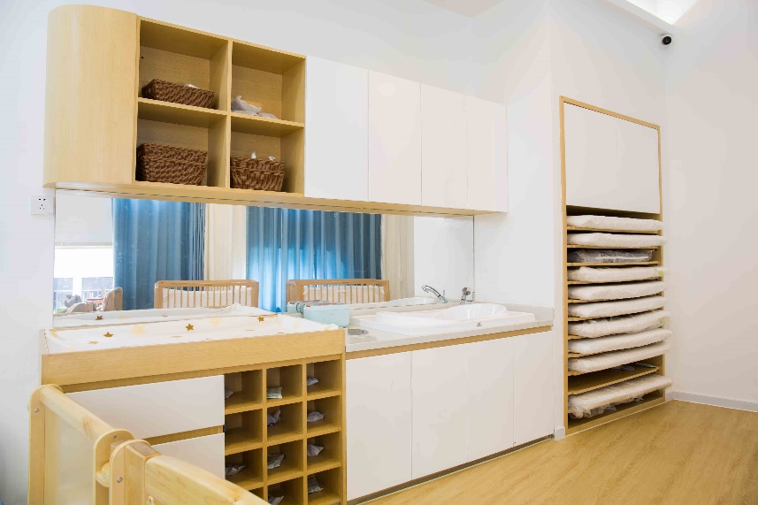 婴儿尿布台,方便教师随时给宝宝更换尿布。独立的尿布垃圾桶,统一收集废弃尿布,统一处理。