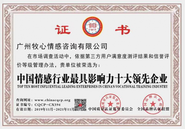 目前,牧心情感咨询凭借其在广大女性客户中取得的广泛好评,而先后荣获了“全国消费者放心满意品牌”、“中国315诚信企业”、“中国情感行业信用AAA级单位”、“中国情感行业最具影响力十大领先企业”等多项荣誉。未来,广州牧心情感咨询有限公司将构建更为完善的情感咨询体系,不断优化升级专家老师队伍,为广大女性提供更为专业的女性情感咨询服务。