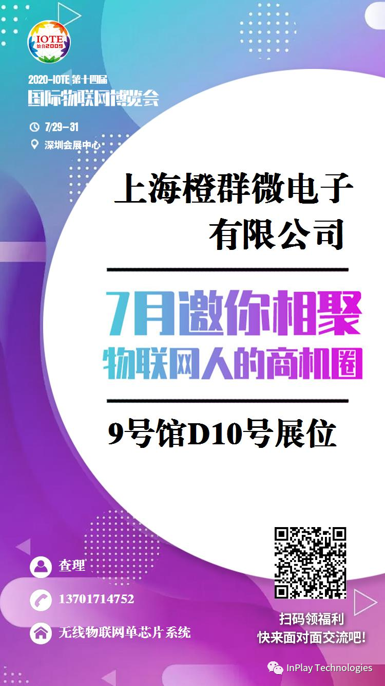 关于更多的上海橙群(InPlay)微电子的产品技术信息以及应用案例,在IOTE2020深圳国际物联网展(7月29日至31日)的现场,我们期待您的来访与交流!