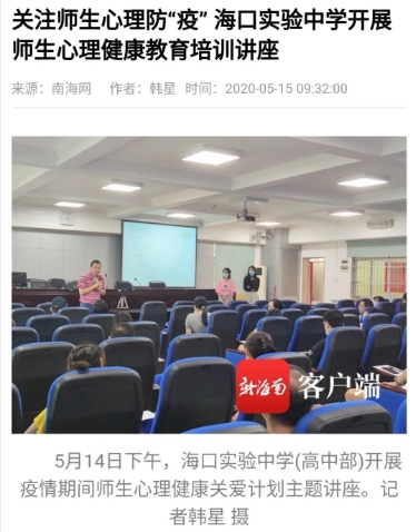 2020年5月14日,“艾博欣心理健康校园行”公益活动走进海口实验中学,举办了一场“疫情期间师生心理健康讲座”,引起了媒体的广泛关注。