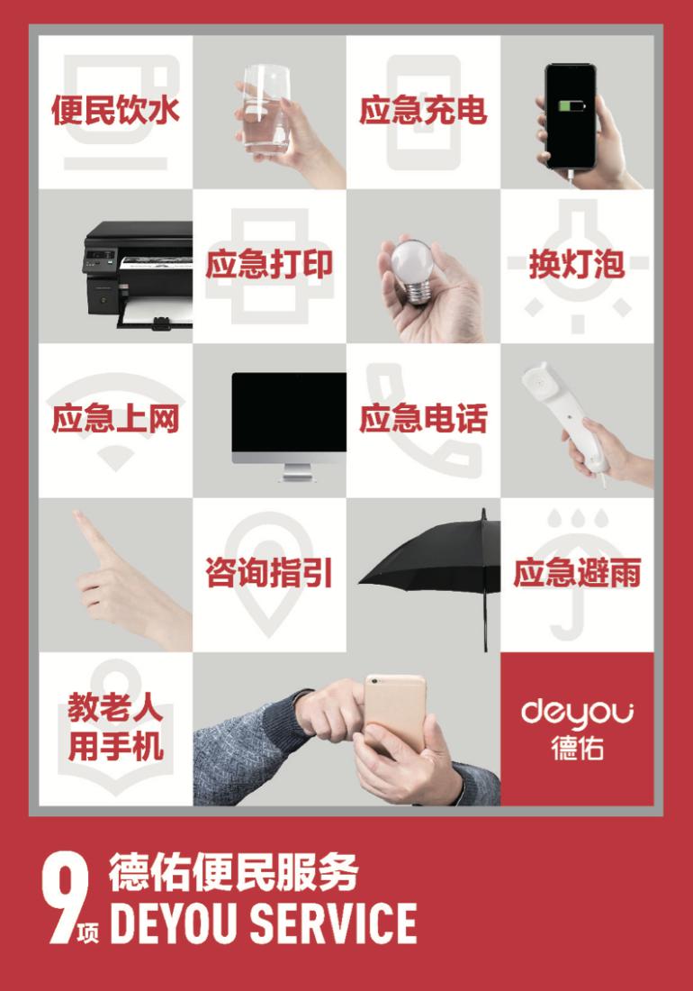 据介绍,深圳德佑已落地“9大便民服务”公益项目,全城门店均提供应急电话、应急上网、应急充电、应急打印复印、便民饮水、询路指引、换灯泡、教老人用手机、应急避雨服务。此外,部分店东还在此基础上提供报刊阅读、快递收发等服务,为居民提供日常帮助。