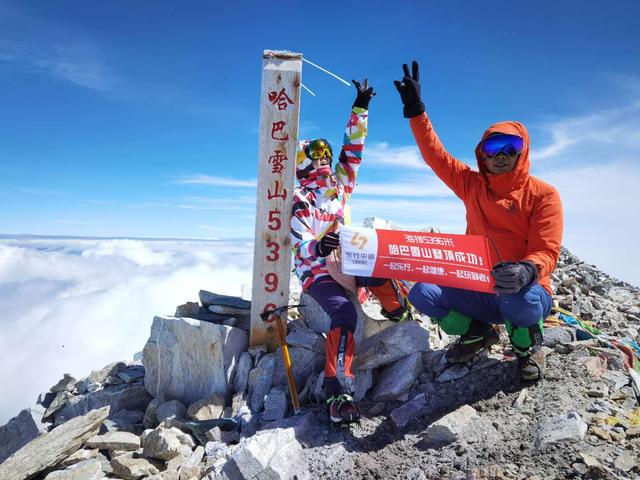 2020年9月20日11:05乐行中国创始人逍遥子携戈友吴佳成功登顶5396米的哈巴雪山。另外,两位山友先行于8:55分登顶。大家凌晨3:15从4100米大本营出发,一路经过原始森林,穿越碎石路段,翻越大石板坡,历经近8小时的攀登。最终登顶哈巴雪山顶峰。