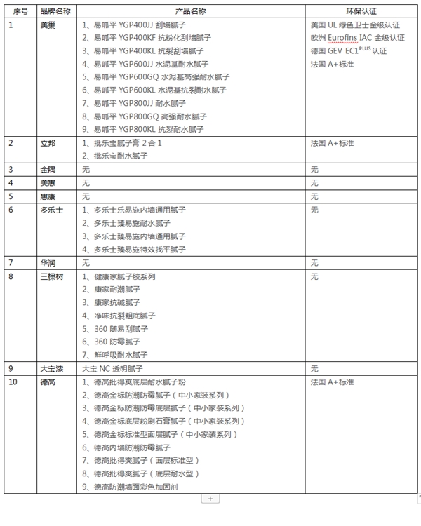市场上环保腻子品牌有很多。通过下表咱们来看看相关品牌及对应产品的环保认证情况。(以下数据源于网易9月室内装饰辅料市场调研报告之墙面篇)