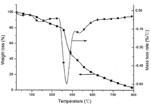 未添加阻燃改性剂雅声乐泡沬的TGA和DTG曲线如下图中所示。由下图可知,未添加阻燃改性剂雅声乐泡沫显示出三个特征温度区域,第一区域为75-135℃,第二区域为135-350℃,第三区域为350-480℃。从图3.22还可以看出,泡沫材料在350℃时分解开始加速,此时残重为81.35%;在408℃时有最大分解速率,产生气体的速率最快,此时残重为60.87%;900℃时,其残重为3.08%。