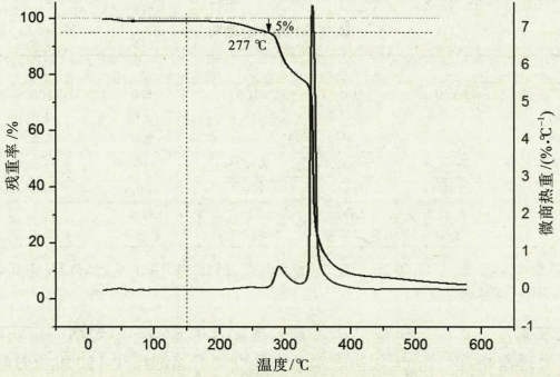 由上图可知,温度达150℃时,泡沫失重小于1%,温度继续升高277℃时,泡沫材料失重约5%。因此再次说明该泡沫在高于150℃后难以确保其热稳定性[5]。