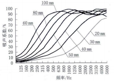 对于中高频声波的吸收效果极为显著,远远优于玻璃绵等常用吸音材料,按照DIN52215标准进行测试获得的雅声乐泡沫吸音性能测试数据表明,随着雅声乐吸音泡沫厚度的增加,吸收的频率范围逐渐增加,当厚度为10cm时,对于200Hz以上声波的吸收率可以达到50%,对于400Hz以上声波的吸收率可以达到90%。