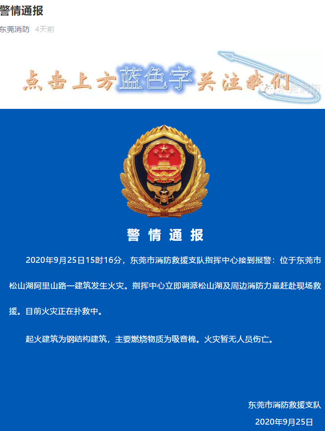 9月25日15时16分,东莞市消防救援支队指挥中心接到报警,东莞松山湖高新区一在建工地起火。15时20分,松山湖消防救援大队到达起火现场进行扑救。起火建筑为单层钢架结构,面积约5000平方米,正在装修施工中,未正式启用。起火建筑为钢结构建筑,主要燃烧物质为吸音绵。