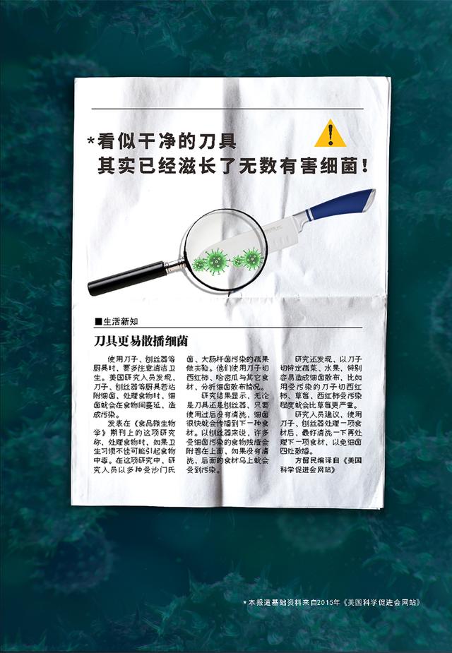 就这样,各种细菌就随着刀具不断接触生熟食物而不断地蔓延开去,并不断增殖。最终刀具成为了意想不到的细菌传染源。