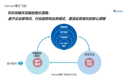 原色咨询发现:无论是资源驱动型还是创新驱动型的企业,在完成0到1的发展之后,会进入产品和渠道扩张的蜜月期。然而,企业在达到粗放式发展的顶峰时,则会遭受许多阻力,就像是一个人抱着一篮子鸡蛋跑楼梯,时刻担心有打翻篮子的风险。原色咨询认为,企业跨越规模发展的大台阶,需要放下现成业务,重新审视和梳理自己的增长逻辑。如果跨越了这个规模发展的大台阶,实现百亿目标就能成为一个大概率事件。因此我们将跨越发展台阶定义为成就百亿事业的关键任务。近年来,原色咨询基于以往服务超大型企业的经验,开始更多地服务于几十亿规模的企业。我们发现这个规模的企业往往是在竞争中动态调整战略才达到现在的市场地位,但是整体的专业能力沉淀不足,所以在服务过程中咨询需求范围宽泛、各类专业及业务课题都要覆盖。在服务过程中,我们不断优化调整咨询方法,成功助力了一批客户重拾增长,成就了客户的百亿事业。在这一过程中,原色咨询总结出“增长飞轮”的设计方式,它能够更加简单清晰地呈现战略规划的核心,并且有利于检验战略规划中增长逻辑的严谨性,为企业跨越发展台阶提供了一种新的思路。Uanser增长飞轮