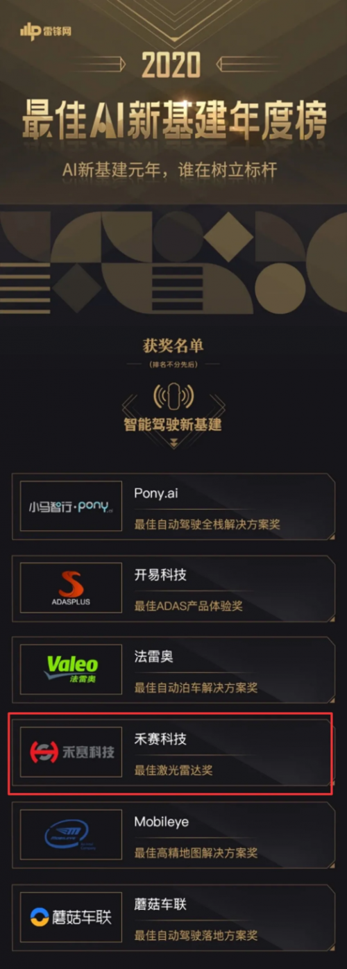 自“新基建”概念提出以来,包括人工智能在内的诸多新型基础设施建设速度日渐加快。在此大背景下,雷锋网紧抓AI市场化急速前进节点,重磅启动「2020最佳AI新基建年度榜」,并于近日发布榜单。其中,禾赛科技从诸多参选企业及产品中脱颖而出,荣获智能驾驶新基建·最佳雷达奖。