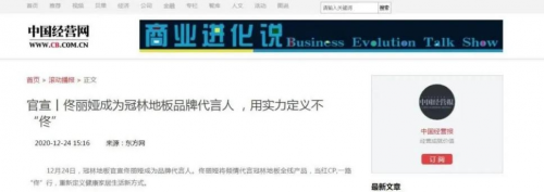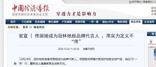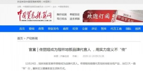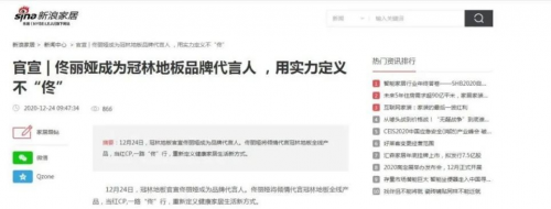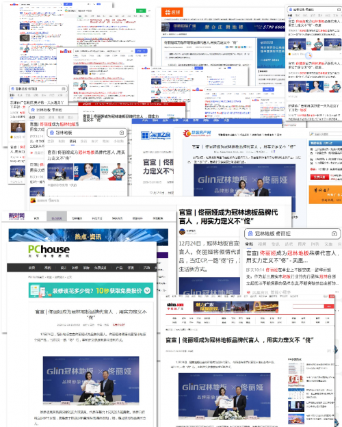 冠林地板官宣代言人后各大媒体纷纷跟踪报道,引发全网轰动热潮,截至目前有网易新闻、腾讯网、腾讯家居、新浪网、搜狐新闻、中国青年网、中国日报网、中国网首发、中华网、太平洋家居网、中国经济导报、中国经营网、中国贸易报、新财网、东方网-企业、房讯网、凤凰网、慧聪网、上海热线、深圳之窗等行业主流、权威媒体对冠林地板进行传播报道。(以上媒体排名不分先后,特此鸣谢各大媒体的报道支持)