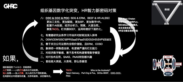 我们今天的主题是“站在未来往回看”,审视如上这张图,我们设想一下未来是怎样的?现在我们有一只活鸡,两边是我们的老板,人力资源需要思考“老板在想什么”?一种可能是老板是想做餐饮;另一个可能是老板想做养鸡场。如果是做餐饮,HR需要前瞻性的准备灶台、柴火、厨物、餐具等,如果要做一个养殖业,那HR需要准备温室、灯具、草场、饲料等。所以作为人力资源管理者,我们需要想到公司未来是什么样子,准确把控并为此做好准备。现在我们面临着这样一个问题:组织基因概念上发生了一些变迁,HR需要哪些新密码来应对呢?接下来我将给大家详细解读。
