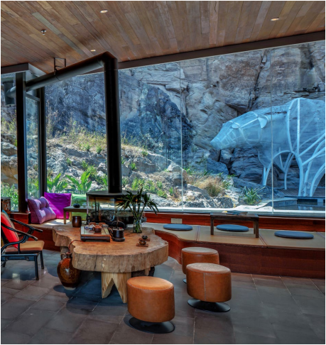 走进这里,入目皆是原石木竹与玻璃、钢结构堆叠出的拙朴自然,衬着户外的山、崖、林、泉,有一种“羚羊挂角,无迹可寻”的浑融和睦。展厅中间的巨大台桌是云南大山里的彝族人斧斫刀削而成,桌板顶端的两个洞无声诉说着它是如何在人力马匹的帮助下走出莽莽深山。背景墙被打成了博古架,上面摆放着易成亲自从玛御谷当地人手中讨来的各种小物件。前台的柴火也是他从腾冲的农村里拉来,平日里烧炉子就直接从这里取用。茶台边上是易成自己亲手打理的花园,每次出差回来,他都要进去修修剪剪一番。但凡外出,易成也总爱给酒店添置些东西——从木材厂老板那里要来的木片,成了酒吧的留言墙;去高黎贡采风得来的灵感,成了酒店外的网红打卡艺术品—《有熊》与《归巢》。