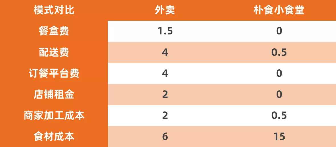 此模式一经推出,立马在市场上引起巨大轰动,我们分析一下两种模式的成本结构,以琶洲商圈为例,一份20元的外卖,成本构成如下,食材成本远远占不到总价格的30%,中间费用巨大,这也造成外卖贵,口味不佳的主要原因:
