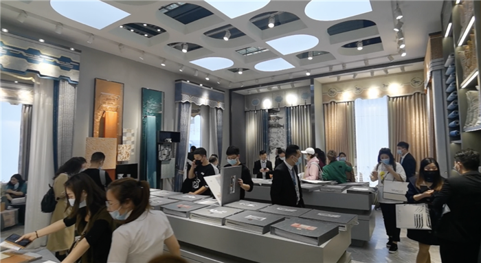 【周总】:好的,简单介绍一下。不知道主持人和摄影师有没有在我们展厅里看一下,以及有没有感受到一进来整个门面的,整体的形象设计。今年在设计这一方面,我们有了一个全新的提升,全新是指往品牌的路线去包装、去深化。现在的话,我们想让别人进来以后,能够感受到品牌的气势程度,这是布语生活要做的一个深入点。还有一个在产品这一块,包括今年布语生活开发的产品,从色系上来说,都比较偏向于居家型,偏向于比较市场畅销的产品色系,以这样的方式去做,让整体设计看起来比较舒服。在这个基础上,对于墙布的开发,墙布版本的系列,我们根据窗帘进行了整体空间上的搭配。也就说我们的店面,真正意义上,可以用布语生活的产品可以打造出一个整体空间上的视觉效果。
