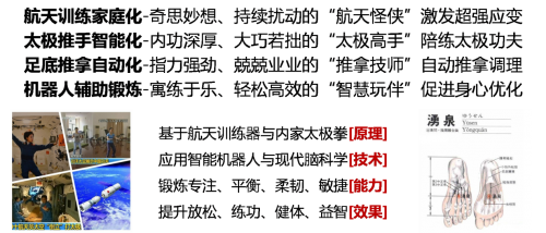 搓脚心、练太极都很好,但较难自觉坚持,姚前也遇到这个难题,好在他探索航天员训练、太空打太极时,突发灵感提出“机器人辅助锻炼”。连老教授指点+父母支持+老师帮助+学生创意,老中青少合作,“机器人辅助锻炼、航天训练家庭化、太极推手智能化、足底推拿自动化”的奇思妙想,幸运转化为身心锻炼神器——固柢机器人·学霸锻炼机。