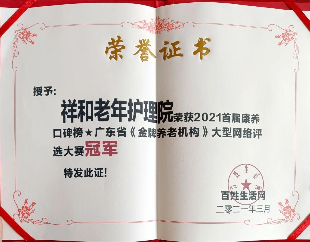 3月8日,2021年首届广东“金牌养老机构”大型网络评选大赛落下帷幕,惠州市祥和老年护理院荣获“第一名”。