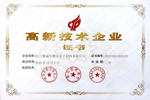 近日,我公司收到了由四川省科学技术厅、四川省财政厅、国家税务总局四川省税务局联合颁发的国家高新技术企业证书。标志着蓉诚华塑正式迈入了国家高新技术企业行列,也是行业内为数不多拥有获得国家高企认定新技术企业称号的企业。