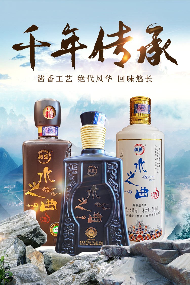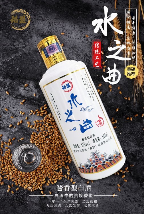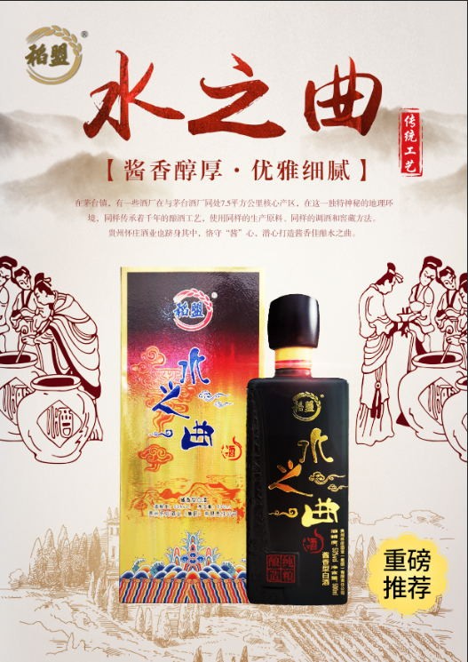 贵州稻盟酒业有限公司成立于2020年10月, 贵州省遵义市仁怀市茅台镇观音寺社区怀庄路。坐落于驰名中外的中国第一酒镇酱香型白酒原产地茅台镇7.5平方公里保护区内。主要生产销售“稻盟牌水之曲”系列酱香型白酒,产品畅销全国各地。其“稻盟”注册商标于2018年获得由国家工商行政管理总局商标局颁发第33类注册商标证书。主导产品“水之曲”酒以茅台镇本地优质红缨子糯高粱,小麦,赤水河水为原料,利用得天独厚的自然环境,恪守茅台镇酱香型白酒传统酿酒工艺,九次蒸馏,八次发酵,七次取酒,历经春、夏、秋、冬一年时间精心酿制而成,从生产储存到出厂历经5年以上。具有酱香突出,优雅细腻,酒体醇厚,回味悠长,空杯留香持久的特点。