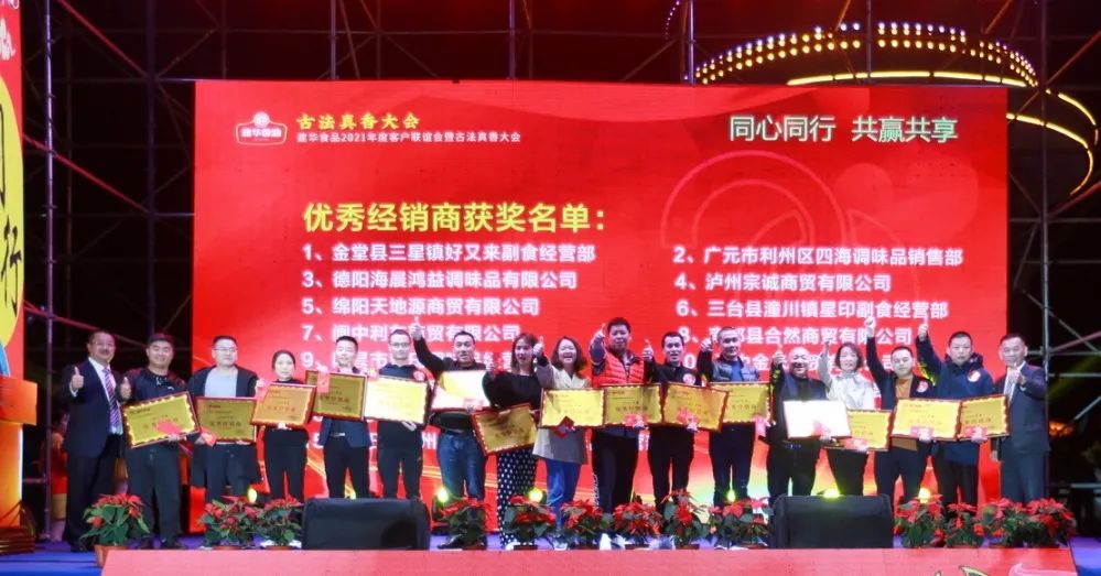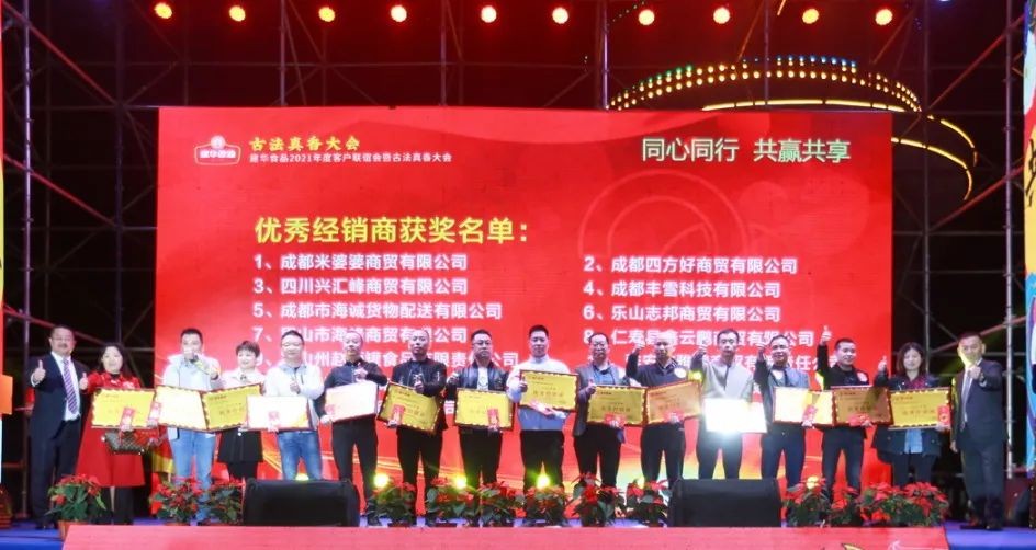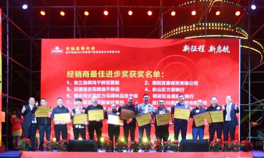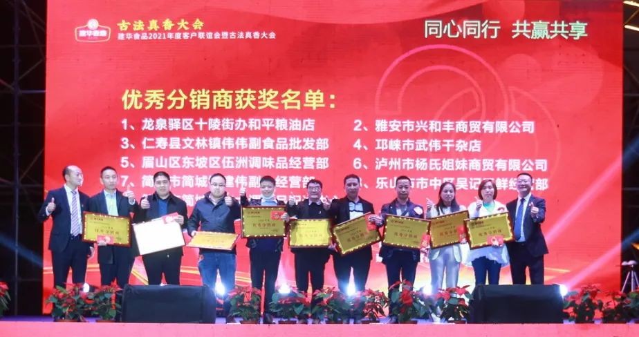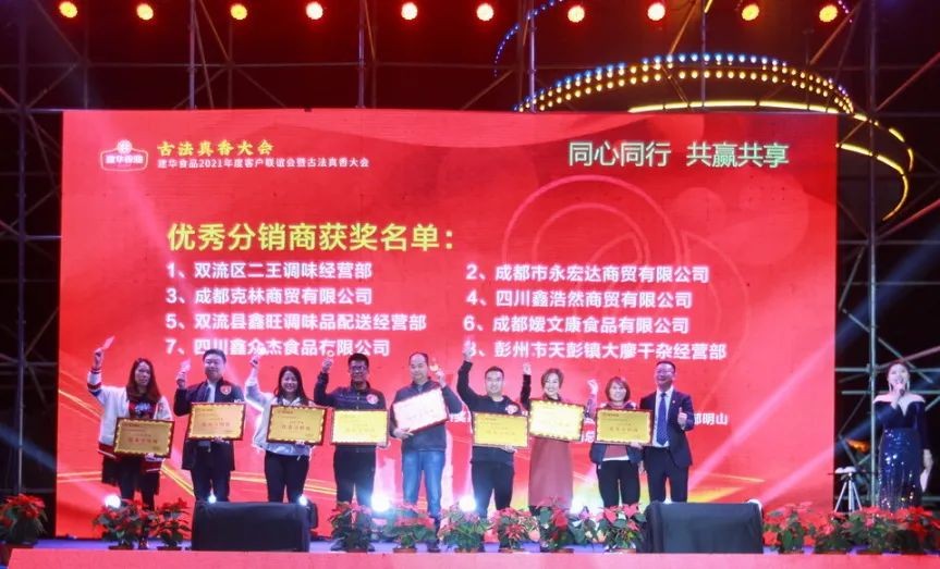 此次大会上,四川成都建华食品有限公司还颁发了17名2020年度《优秀分销商》奖、23名2020年度经销商《最佳进步奖》、29名2020年度《优秀经销商奖》,对严格执行公司管理要求,积极完成年度各项销售指标,主动参与产品推广及市场管理,有效执行公司价格政策,诚信经营的分销商和经销商们表示鼓励和感谢!