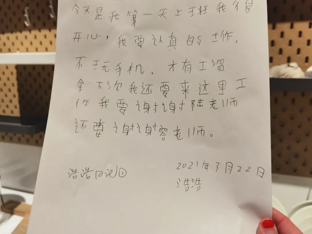 其实,浩浩从小不喜欢看书写字,初中时浩浩的一个老师告诉他:“读书会让你不再孤独。”渐渐地,浩浩在老师的带领下,才慢慢开始学习读书写字,为了让浩浩每天写工作日记,从50个字写到100字再到200字。天真者咖啡的老师不允许浩浩在工作时间玩手机,不玩手机才能有工资。