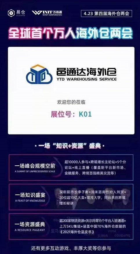 面对几何级的增长跨境卖家数量,“知识盛宴”+“资源盛典”的第四届海外仓两会暨2021全球跨境资源盛典或将带来启发。4月23日,第四届海外仓两会,邑通达海外仓在展位号K01与您不见不散,携手共创,赢战2021,期待您的莅临!