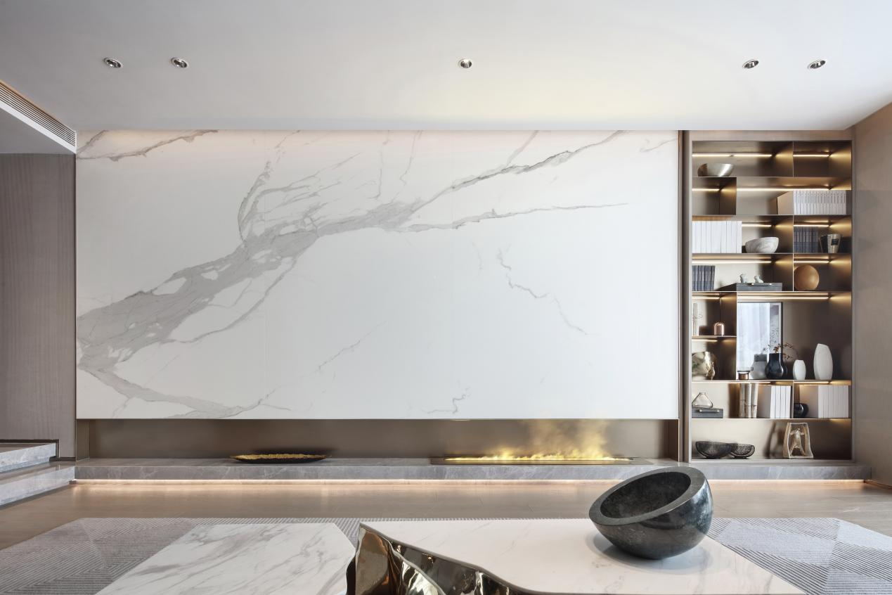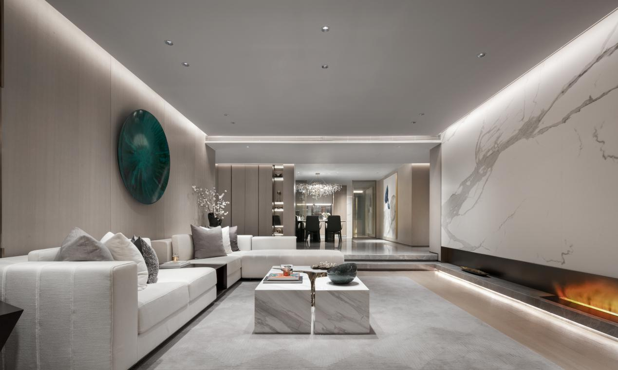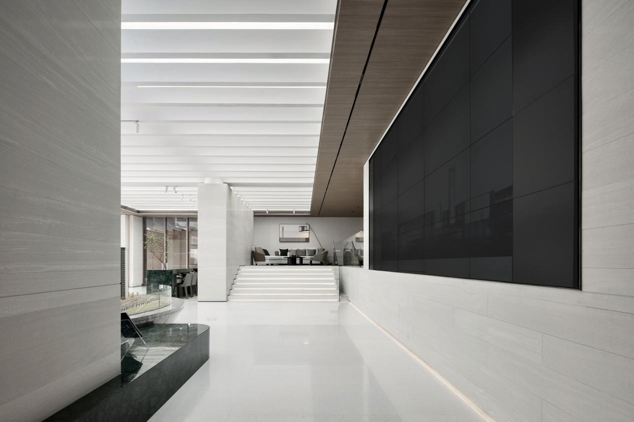 我们负责的一个青岛项目,用艺术的力量丰盈空间气韵,同时采用多媒体装置来丰富空间的功能和科技感,勾勒美学和实用并存的当代风尚,兼纳中西审美特性。