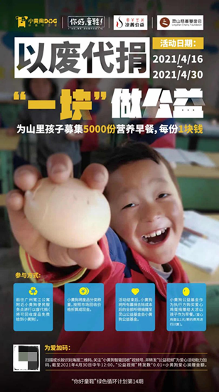4月16日至30日,小黄狗环保科技联合凉善公益发起“你好童鞋”绿色循环计划第14期活动“大凉山营养早餐计划”,在17个城市号召居民通过以废代捐、现金捐赠及转发爱心视频的方式,为大凉山孩子们募集爱心鸡蛋、为营养加餐。