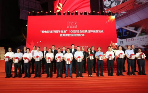 这场红色基因传承活动的举办,离不开社会各界的鼓励与支持。在中国邮政集团、弓立医疗用品有限公司、中国电影博物馆等鼎力支持下,这套定名为“看电影连环画学党史”100部红色经典连环画,首发1万套100万册,全部捐赠给西部13个省100个地市,1万所乡村小学。
