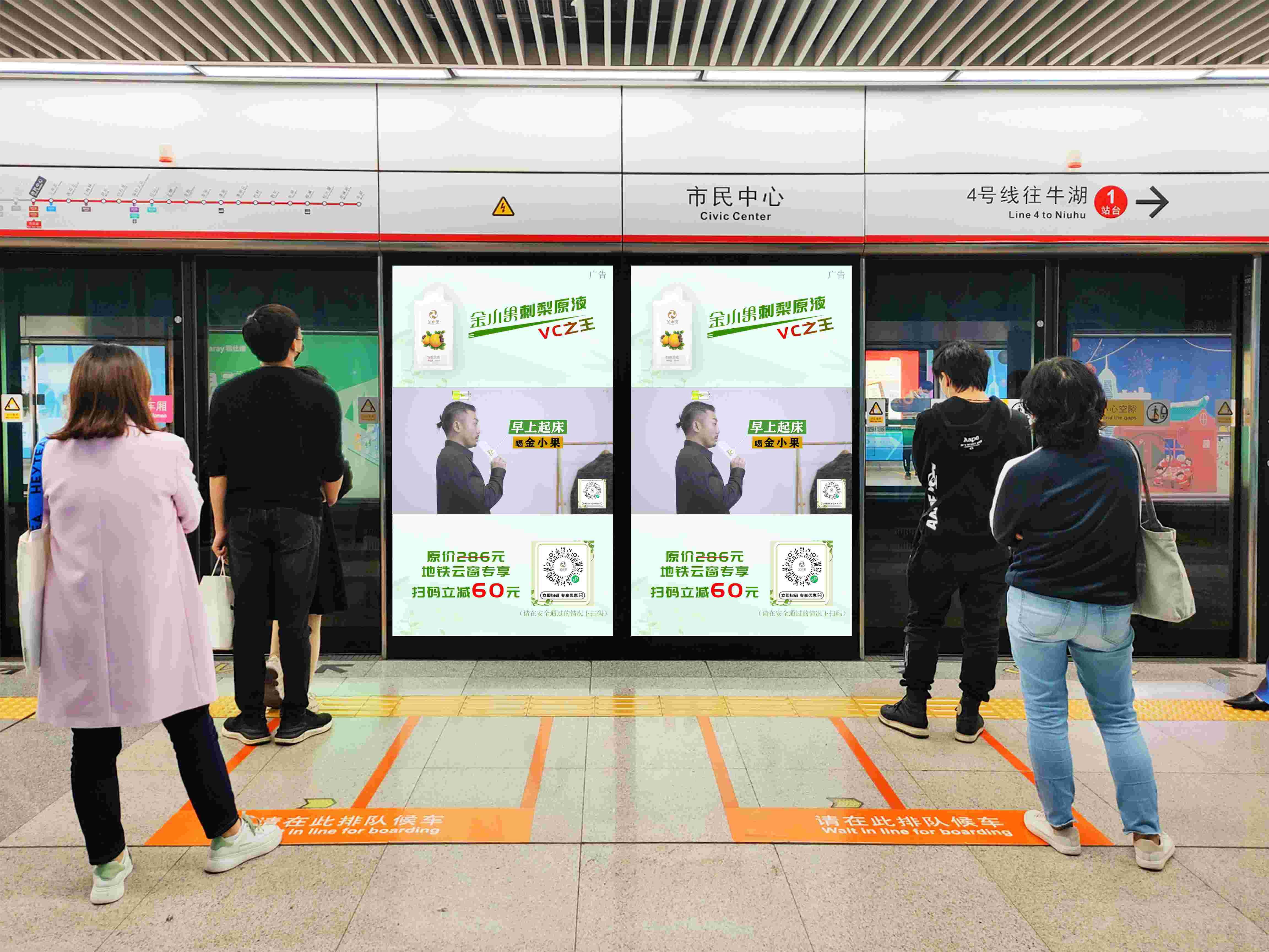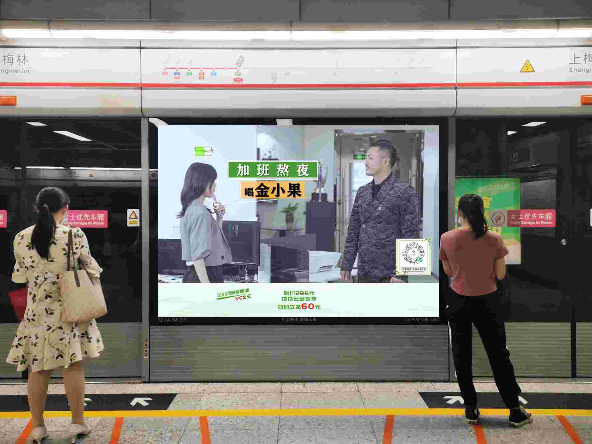引力视讯地铁云窗作为中国最大的站台门巨幕投影媒体,是业内首家通过地铁全套系统认证要求,并拥有多向国家知识产权专利证书、国家级实验室颁发的多项安全检测认证。地铁站台屏蔽门玻璃变为可动态显像的"屏幕"即地铁云窗广告,其具有覆盖主流人群、高密度长停留、近距离冲击力等优势特点,金小果正是结合地铁站内的充足人群的特性,通过地铁云窗传达品牌理念,吸引消费者,实现近距离,强体验、高触达的品牌传播效应,从而达到在服务和营销领域的数字化升级转型。