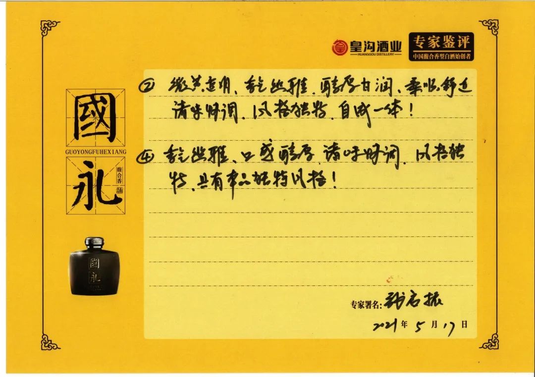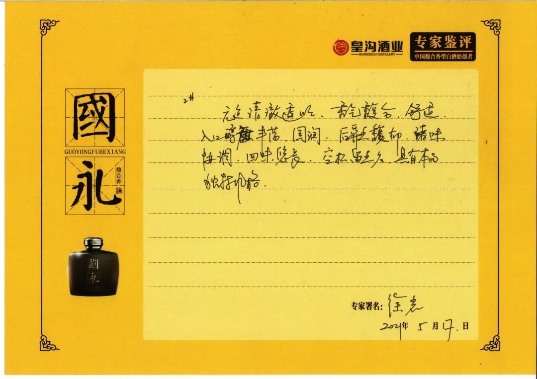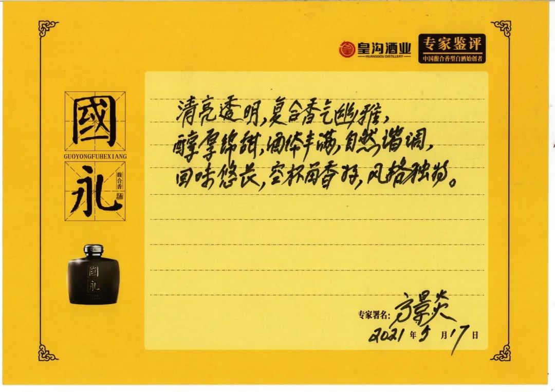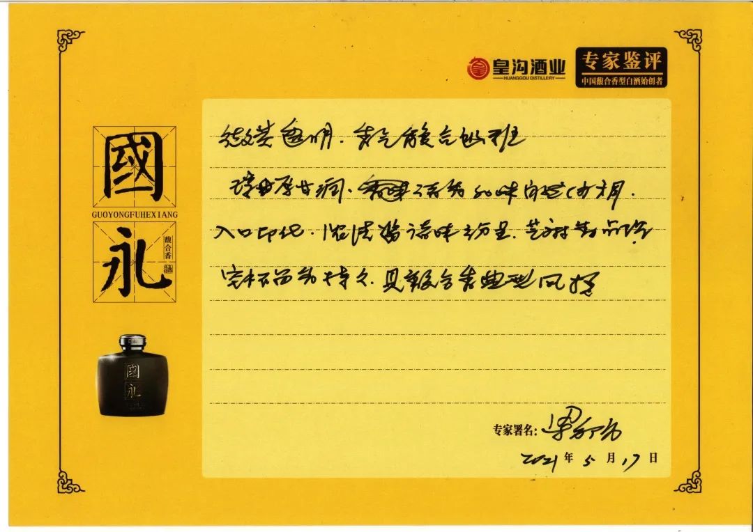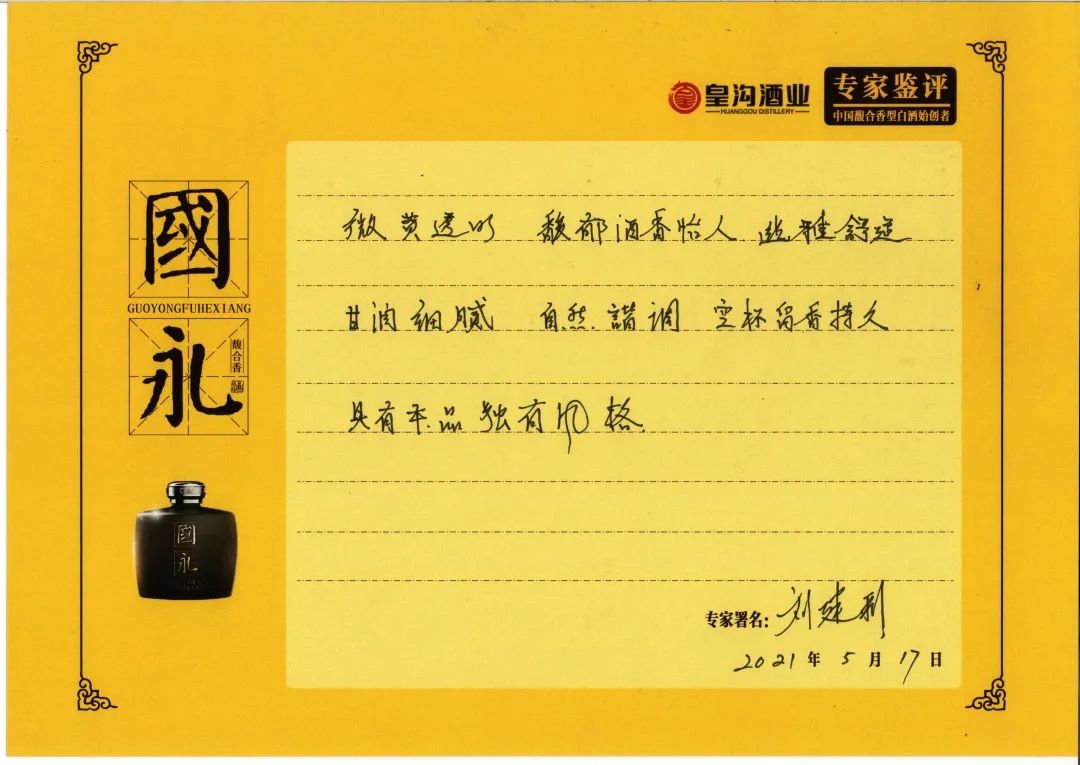 高景炎专家评价皇沟馥合香,清亮透明,复合香气幽雅,醇厚绵甜,酒体丰满,自然谐调,回味悠长,空杯留香,风格独特。