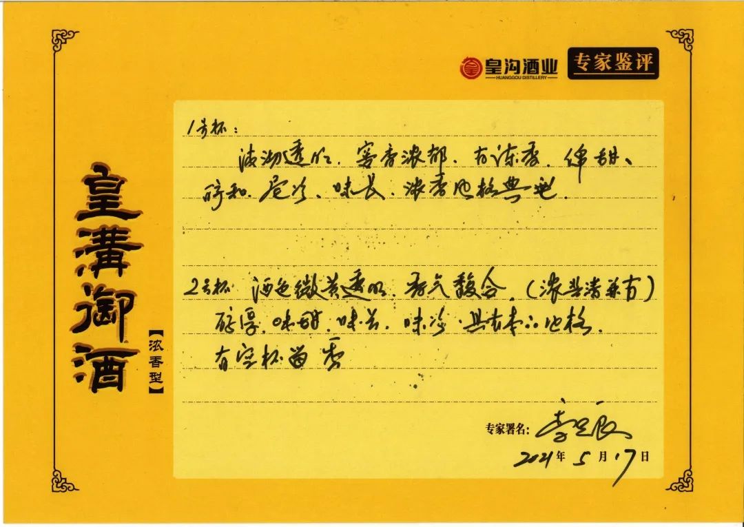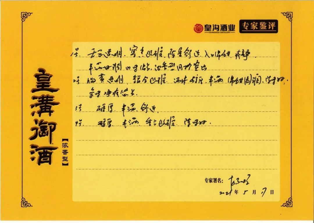 季克良季老鉴评皇沟馥合香酒色微黄透明,白酒香气馥合(浓、酱、清兼有)醇厚,味甜、味长、味净,具本品风格,有空杯留香。