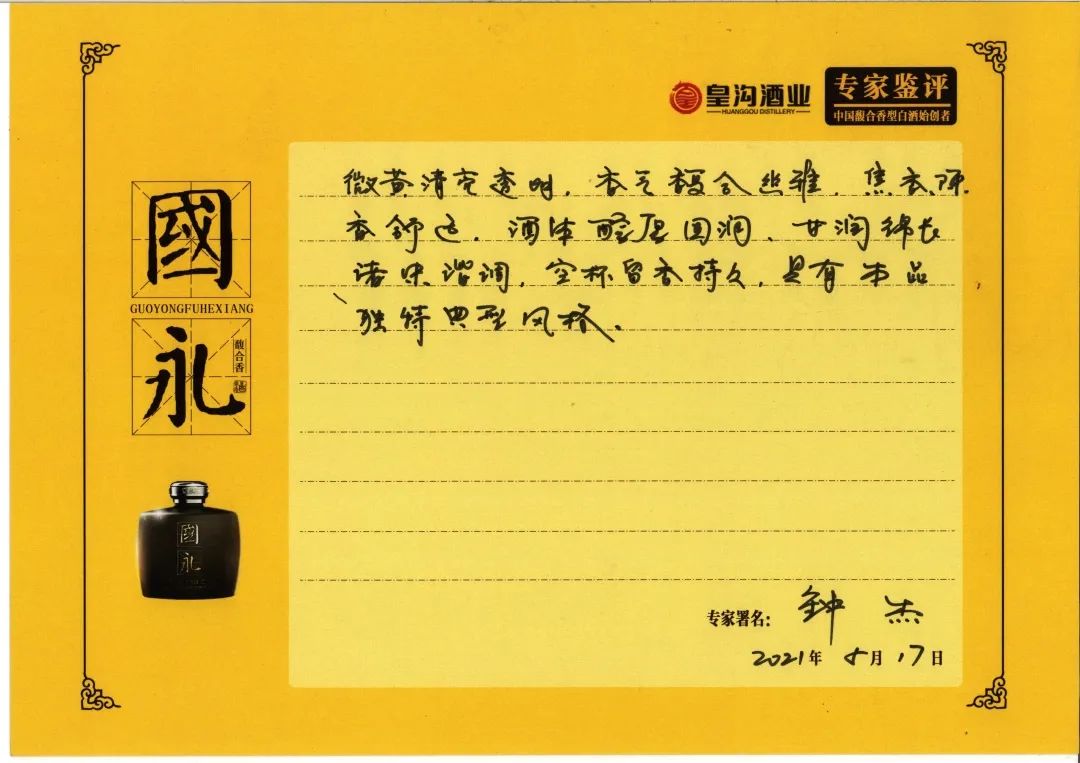经充分研讨和鉴评,12家白酒专家形成了对53度国永馥合香产品的一致鉴评结论,由中国酒业协会理事长宋书玉代表专家组宣读了鉴评结论:“53度国永馥合香白酒清亮透明,香气馥郁幽雅,醇和甘润,诸味协调,酒体丰满,空杯留香,风格独特。”