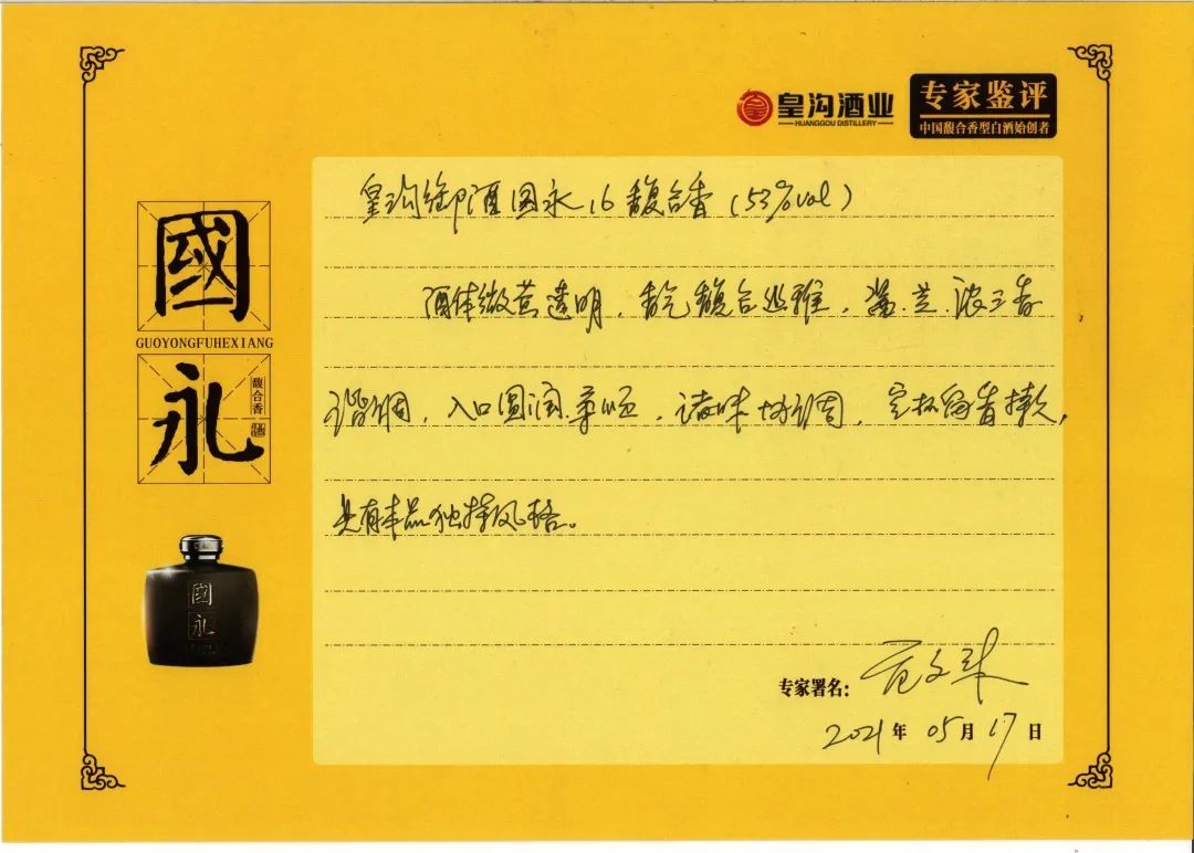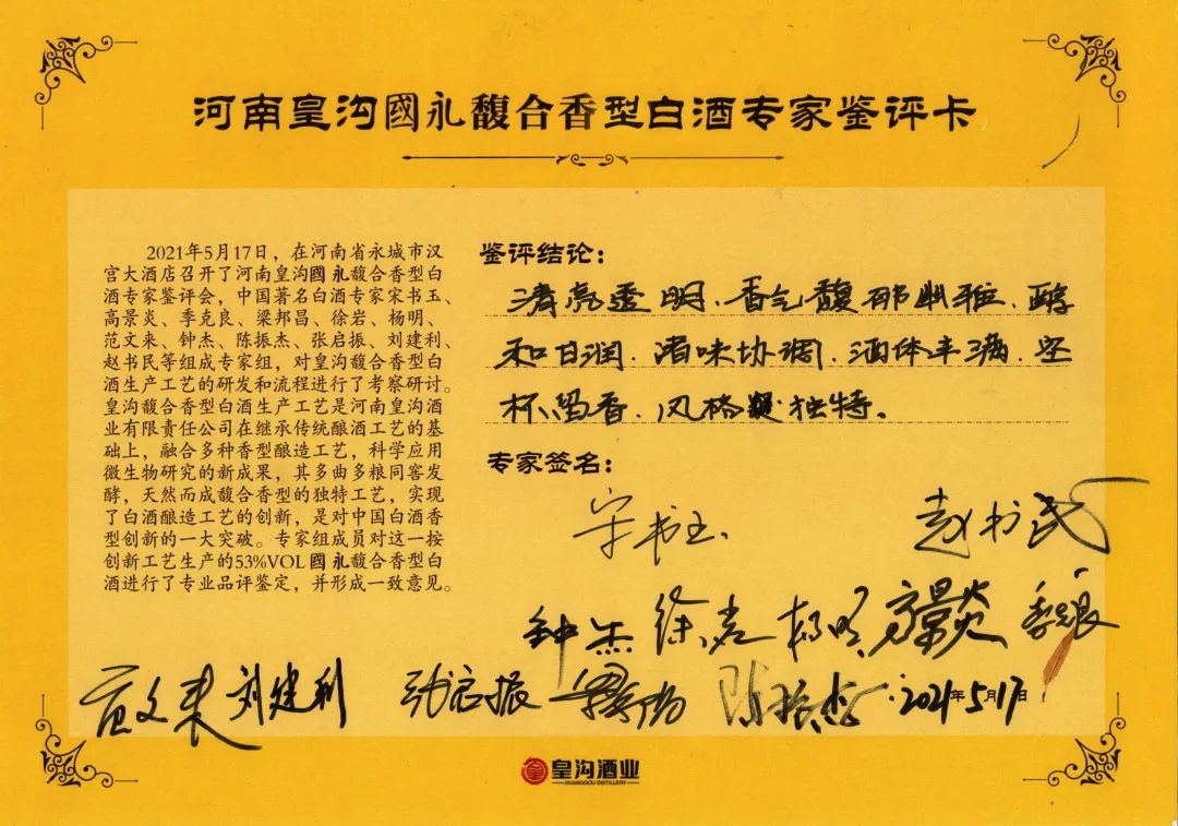 梁邦昌梁老评价皇沟馥合香:微黄透明,香气馥合幽雅,醇厚甘润,诸香多味自然协调,入口即化,浓清酱诸味纷呈,芝麻香凸显,空杯留香持久,具馥合香典型风格。