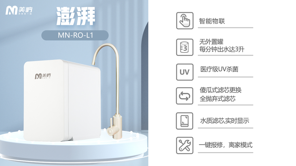 美呐巧妙地跳出净水固化思维,潜心深入了解消费者需求,开拓性创新,研发铸造而成澎湃净水机,向市场证明:消费者要的是用水快,而不是制水快。医疗级UV杀菌,傻瓜式滤芯更换,全抛弃式滤芯,水质滤芯实时显示,一键报修,离家在外依然无忧掌管。