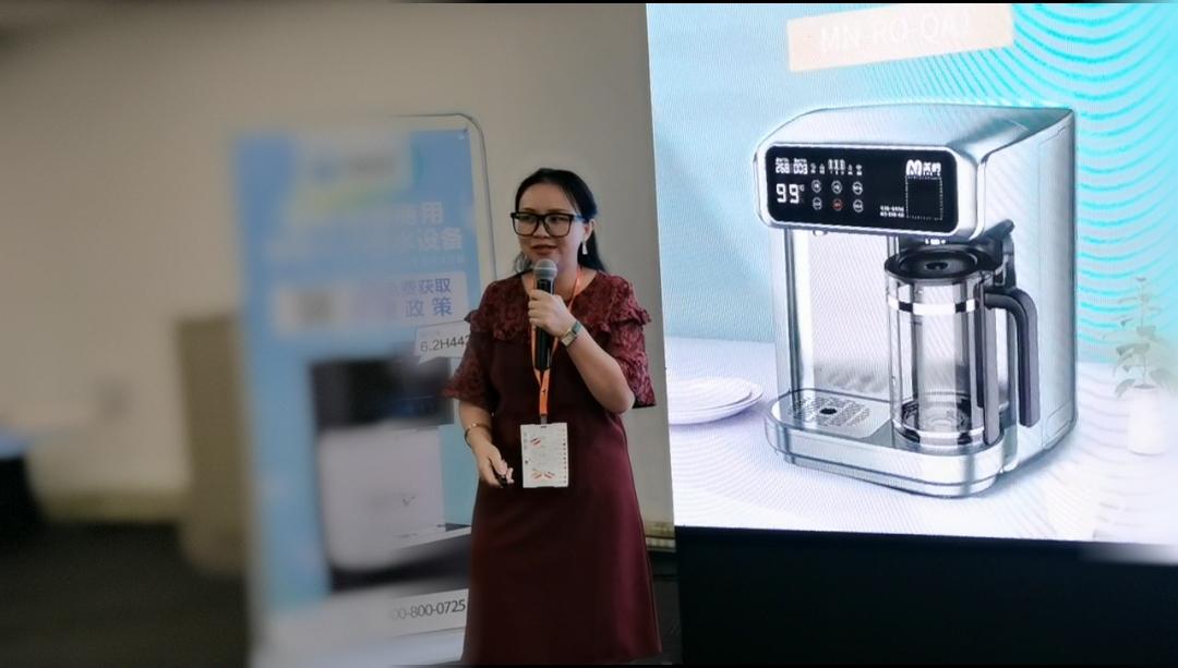 净水同行被美呐吸引,前来了解产品及模式,美呐家人正在详细介绍。