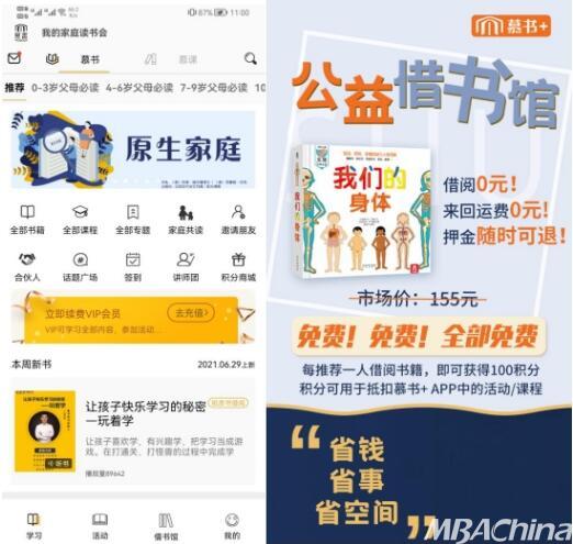 公司成立五年来,认真务实并贴合用户需求的制作内容,手机端从H5页面过度到APP,通过小小的手机屏幕把大家连接在一起,不断提升用户体验和为用户服务的内容。“慕书+“更有谐音“慕书家”,旗下产品“慕书+”APP重点聚焦家庭群体,以让家庭教育更省心为使命,慕书首推“全家共学”模式,融合书籍精华解读、课程、专题、家庭教育指导师培训、绘本阅读指导师培训、借书馆为一体,是采用线上线下OtoO模式运营的家庭教育新锐品牌。自APP上线以来,用户数从0人到300000+,仅仅用了一年多的时间,而这个用户裂变的速度,不是用广告买来的,而是用户通过分享裂变而来。