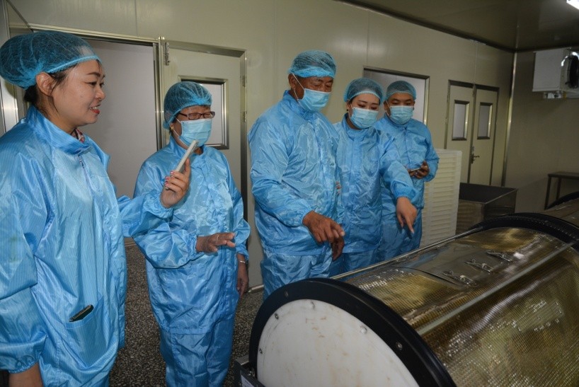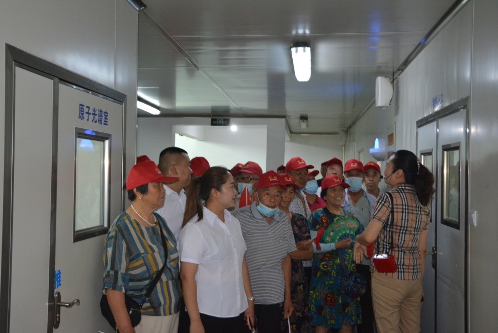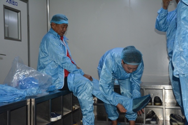 此次带队来的是在蜂亿健品牌有着8年工作经历的李盼盼,她还是蜂亿健品牌吉利店的优秀店长。在带队进入厂区10万级洁净生产车间时,大爷腰不好弯不下去,李盼盼赶紧蹲下去,帮大爷穿好进入车间必须要穿的鞋套。