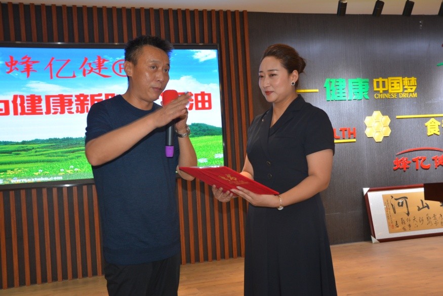 在98位老人见证下,蜂亿健品牌运营执行董事、北京农科亿健蜂产品研究院院长孙长生在蜂亿健礼堂,为李盼盼颁发了蜂亿健品牌宣传部部长聘书。